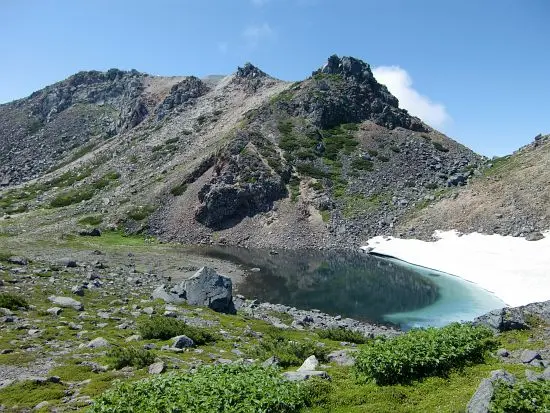 山頂からの展望を満喫し、大汝峰へ向かう。油ヶ池、紺屋ヶ池、翠ヶ池、血ノ池など池めぐりをしながらの楽しい山上散歩ルートだ。チングルマやミヤマダイコンソウなど池畔は花の宝庫。大汝峰の登りは岩場の急登で、広々とした山頂には石室と大汝神社の祠があった。かつて北麓からの登拝ルートでは白山主峰として崇められた時代もあったそうだ。