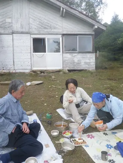 記憶のとおり小屋の前には草地が広がり気持ちがよい。さっそく銀マットを広げて宴会を始める。各自1品ずつ持ち寄ることという指示があったので、私はカレーを持っていったが、純子さんは蛸とミョウガと海苔の酢の物、渡辺さんは生のジャガイモから作るポテトサラダ、川崎リーダーはなんと煮貝、煮マグロ、豆腐、ワカメ等の盛り合わせと、すばらしい食卓だった。女性陣と一緒だと食事が豊かだし華やかである。