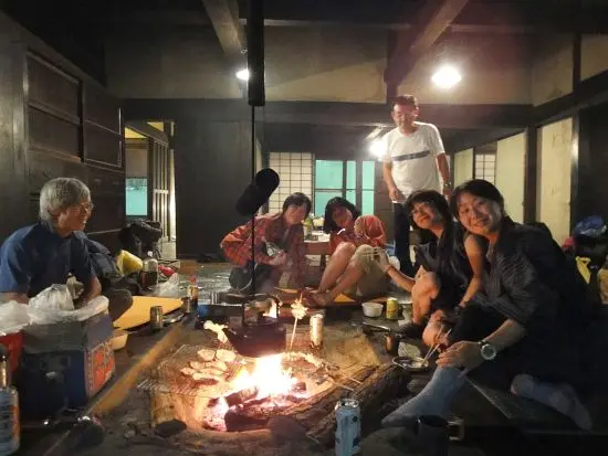到着すると早速火をおこし宴会の準備にとりかかる。ヤマクニさんは朝から体調が優れず、すぐに隣の間で寝込んでしまった。囲炉裏を使い試してみたかった串焼きや網焼きのアレコレをつまみに飲み始めると、峯川さんが備え付けのカマドを使いお米を炊いてくれた。本場の釜炊きのご飯は皆が絶賛するほど美味だった。囲炉裏の前にドスンと座り込んで動かない我々を尻目に今度は風呂を薪で焚き始めた。我々腰重い組にとっては大感謝なのだが、きっと本人のじっとしていられない性格と古民家という遊び場があいまって、とにかく座らずよく動いていたのが印象的だった。その後は焚いたお風呂に入る人もあれば、途中で眠りこける人もいれば、復活して食べ始める人もいたりでおもいおもいに夏の夜を過ごした。夜も更けると雨も止んでいたので庭先に出て持ち込んだ花火で遊び囲炉裏宴会を締めくくった。