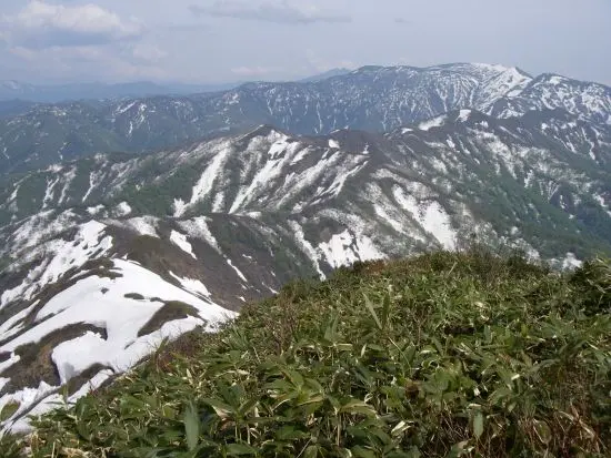 鉄砲平の先で三国川と別れ急登になる。この分岐には釣り師がテントを張っていた。ここをベースに、山菜を採りながらのんびりと釣りをするのも良いな、と思ったが山菜は判らず釣りもへたくそなので、えっちらおっちら歩くしかない。200mほど登って尾根に出たところで、下りに使う日向山の尾根、その奥に八海山が見える。ギザギザの稜線が格好よく思った以上に重量感もある。そのうちに行かねばなるまい。