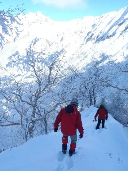 初日、とても寒いがお天気は最高。行者小屋にザックをおいて偵察へ。雪も少なくアイゼン、ピッケルなしで中岳沢を登り適当なところで尾根へあがる。