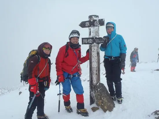 その後は、リーダーのクリップを最小限に抑えた軽快なリードで順調に進む。1ピッチ目は第一岩稜の左側の岩の間から若干右に回り込みながら登り、そのまま少し登って今度は右側から尾根側に戻るように直登し、雪稜を登る。(恐らく2ピッチ分1回でいったかな。)2ピッチ目でまた若干の渋滞を待って、稜線少し右側を登り岩場が終わるとそのまま少し歩いて12時頃阿弥陀岳山頂に到着。