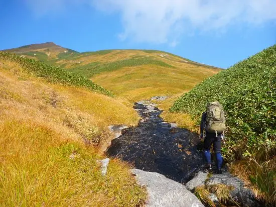 朝、紅葉が一段と進んでいた。残りの沢を遡行し、噂に名高い「天国へのツメ」へ。草原の黄金色と青空のコントラストが美しい。