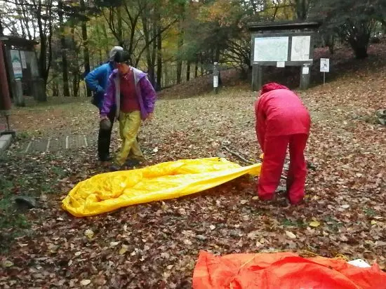 幸い雨は降ったり止んだりになりましたが風が出て来たので、風向きを考慮して張る場所を選び、重石を探して来たり、支柱にするストックや木の枝の調整をしたり、細引きの結び方をおさらいしたりと、三澤さんの指導のもと、試行錯誤しながら張ってみました。地面から雨水が染み込まないか心配でしたが、それも銀マットで凌ぐことができそうでした。