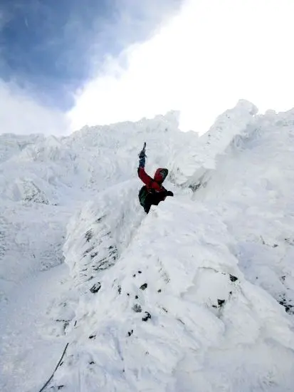 小雪が舞い視界も悪い中、ヘッデンを点けて6:15に出発する。取付き手前で準備していると取付き付近に2名の先行パーティーが見えるが、何故か戻ってくる。声を掛けると一人体調が悪いようで下山するとのこと。と、いうことで本日は我々が一番乗りだ。下部岩壁は、昨日の偵察時と同じで雪がべったり。雪の下が草付だとバイルが刺さるが、下が岩だとはじかれる。下の様子は全面雪がべったりで全く分からないので、バイルで叩きながら確認し、草付を拾って登っていく。下部岩壁は2ピッチだが途中ランナーはとれないので、トップの滑落は致命的だ。1P目の終了点は潅木でとれる。下部岩壁を通過すると雪壁となり40m×4ピッチとなるが、こちらはダブルアックスで快適に行けるのと、3人だとロープワークが複雑で時間がかかるので、ノーロープで登る。更に上のリッジは通常コンテだが、こちらもそのままノーロープで進む。相変わらずガスっていて視界は利かない。雪も深くはないがラッセルとなり、ここはナベさんが前に出てぐいぐい進む。是非若手女子会員にも見て貰いたい勇姿だったが、残念ながら今回は野郎3人パーティーなので、特に下山後の成果はなさそうだ?