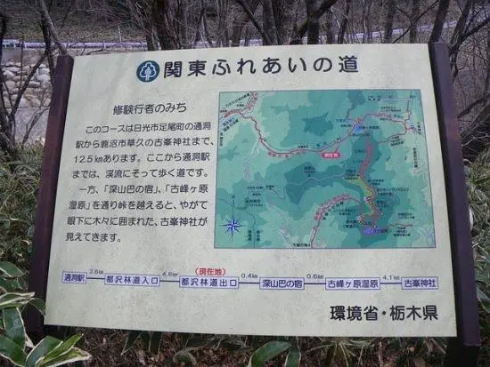 新鹿沼駅=古峰神社(8:40) → 登山口【三枚石新道】(8:50) → 三枚石(10:25~45) → 古峰原湿原(11:30~50) → 深山巴ノ宿(12:00) → 戸沢林道分岐(13:19) → 通洞駅(13:50)
