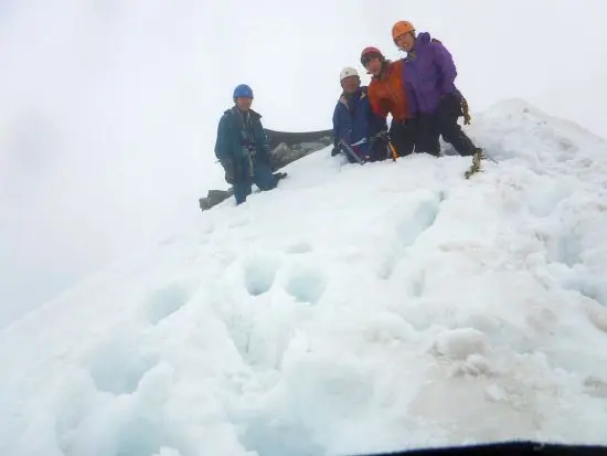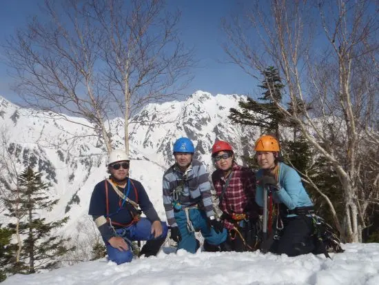P3へ向けて雪壁を少し登ると密藪となりザックが引っかかって身動きが取れずに四苦八苦する。短い密藪を抜けて雪稜をしばらく行くと5m程の懸垂となる。その先は雪が切れて段差になった急雪壁を登る。段差の部分は木登りとなる。登り詰めるとP3に着く。