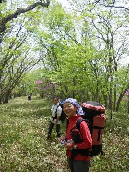 カラマツが終わると、山ツツジ、ミツバツツジ、サラサドウダン、シロヤシオ、山桜と目を飽きさせることはない。シャッターを押すたびに足が止まる。笹藪も膝までで気にならない。ゆったりした登り、空は青い、最高の登山日和なのに、中澤氏と前野氏2人、脚がつる。肩が痛いと大騒ぎ。この調子では、本日の幕場予定地迄は遠いかも。