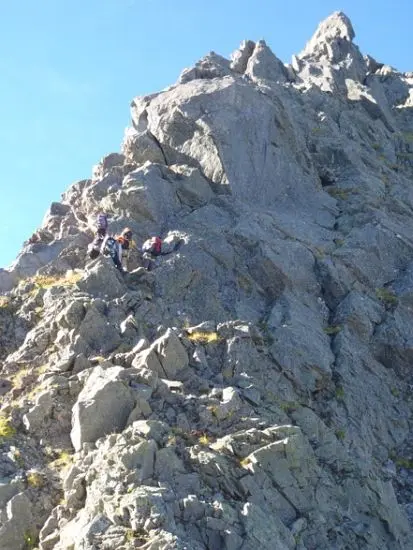 1時間以上待ってようやく順番が廻ってきた。4ピッチあるので最初のピッチを行かせてもらう。ちょっと登ったところに開始点がある。情報によるとやや左寄りに登って行くと支点に導かれるように自然に登れるとあったので、支点を見ながら登るがどうやら直登気味に来てしまったようで、スラブの岩を登ることができず、右側に回り込んで正面目に登ると小さなテラスに着いた。前のパーティの人がやや下がった左側でビレイしていた。どうやら一般ルートでないところを登ってしまったらしい。少し待ってビレイ点が空き、下がってセットするがロープが引けなくなってしまったので、テラスに戻り肩がらみでビレイした。2ピッチ目は正面右側のガリーを星野くんがスムーズに行く。3ピッチ目は手がかりのあるクラック、4ピッチ目もルートが明確にわかり快適だった。