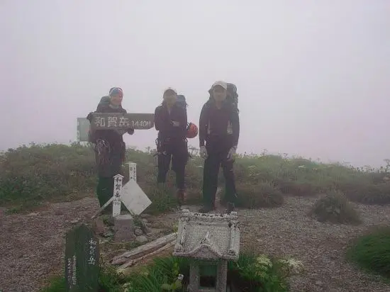 長めの休憩をとり、靴を履き替えて和賀岳を目指す。5分ほどで山頂到着。ガスに包まれて展望は全くなし。晴れていればすごく展望の良い所なのに残念だ。代わりに高山植物が今が盛りと咲き誇っている。名前など知らないが白、ピンク、黄色、紫、オレンジと多彩な花たちの饗宴だ。何も見えないので写真を撮ってさっさと下山にかかる。撮った写真も真っ白で人の顔も分からない始末だ。