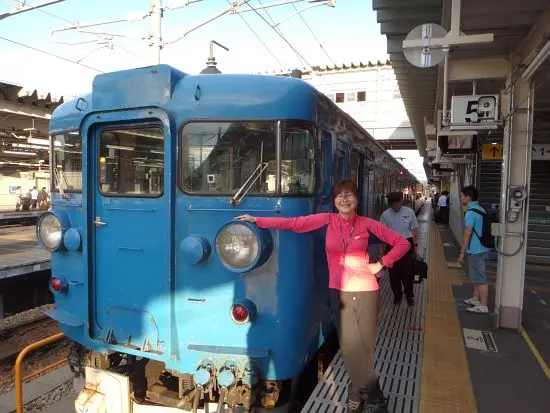 準備も完了したので、北陸本線のホームへ移動する。しばらくして、真っ青なカラーが鮮やかな475系A18編成がホームにやってきた。レトロな雰囲気でとてもかわいい電車だ。東京では見られない車両に乗れるのが嬉しい。
