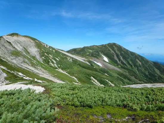 稜線は立木が少なくなり、ハイマツが拡がる。今までうっそうとした森の中を歩いていたので、ハイマツに出会ってやっとアルプスに来た、高い山に来たんだなという実感がわいた。この辺りは白馬岳と同じように、東側が急斜面の二重山稜が続いているのがよくわかる。