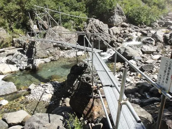 いつのまにか、辺りは樹林帯に変わり、鉄パイプの橋をわたれば、蓮華温泉は近い。鉢の鞍部から5時間半ほどで、蓮華温泉に到着した。蓮華温泉では、稜線での風が嘘のように、風もなく、かんかん照りの夏日だった。蓮華温泉からは、バスの最終便が出たあとだったので、タクシーを呼び、タクシーが来るまでの1時間、温泉につかったりしてのんびり過ごした。