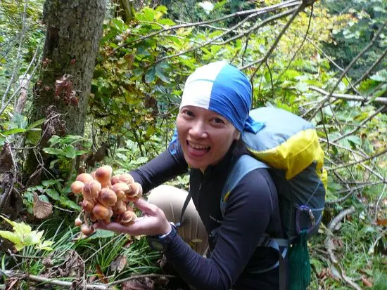 展望を楽しんだ後、下山開始、ひかば越えからは急坂になるが、ジグザグの道で思ったより降り易い。途中沢沿いのコースになるが、危険な所はほとんど無い。下りで正真正銘のナラタケをゲット、先に採ったナラタケもどきはお払い箱となった。その後ヌメリスギタケモドキ発見、木の上に出ているものはお杉と金子さんの努力で、これもゲット。キノコ山行に相応しい量が採れて満足である。