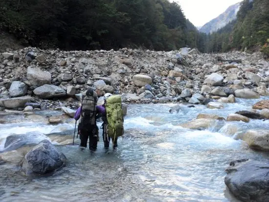 7日は6時発、吊り橋を渡ると右が伊藤新道、左が北鎌尾根と小さく表示がでる。ここで整備道はなくなる。左側の川原に下りるとそのまま10回以上渡渉を繰り返しながら千天出合に向かう。特に危険な箇所はないが水量の多い場所ではスクラムで渡渉する。まるで沢登りにきた気分だ。千天出合には8時半到着、沢靴も持ってきたため「チャレンジアルパインクライミング」のコースタイムより1時間半時間短縮。頑張れば初日でここまで到着可能だったがあまりいい幕場がない。貧乏沢を過ぎ北鎌コルへの取付きには11時半到着(所要2時間半)。コルには15時到着(所要3時間)。千天出合以降は逆に1時間半多くかかった。北鎌沢の紅葉はとても綺麗だ。