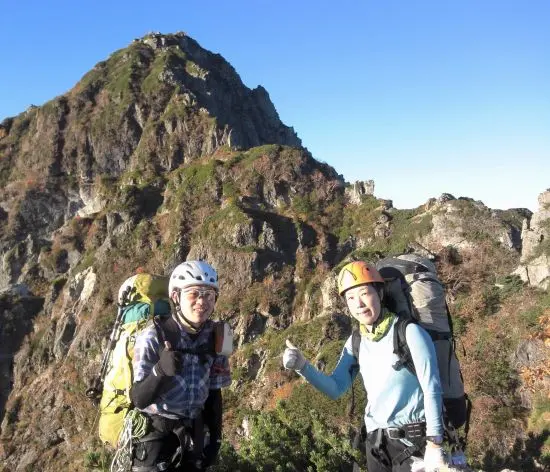 8日も6時前に順調にスタートするが、独標を臨むP8で滑落事故発生。谷底まで落ちたのか、途中のハイ松に引っかかり急死に一生を得ているのか滑落地点からは分からない。とりあえずハイ松の際までダブルで25m下降するが見当たらない、そこでシングルに切り替えてもらいさらに下降すると約45m地点で辛うじて松の間に挟まっていた。滑落した「私のザック」には、テント、シュラフ、着替え、食料、現金、免許証、家の鍵など全てが入っており、回収できていなかったら洒落では済まない。こんなに良い天気の中、行くのも戻るのも小屋まで一日で必死の行程が強いられたはずだ。滑落の原因は、出発しようとして背負いかけたザックを一度降ろした際に不安定な状態のまま離れたこと。