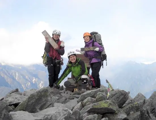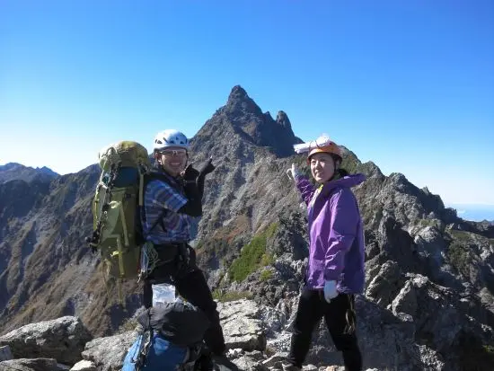クライマックスの総仕上げは突然に訪れた。槍穂の登りはロープなしで行けるが、やはりここは最後の演出をしたいところだ。2ピッチ目は頂上やぐらの直ぐ下でビレイするため、一般登山者を観客に気持ちよく登れる。時には「ロープなんかいらないのに」と野次まがいのことを言う失礼な観客もいるらしいが、我々の場合は山ガールから拍手喝采をもらい山頂では握手、一緒に記念撮影も。とても気分が良かった。若手T君も鼻の穴を大きくして半ば興奮気味でした。ゆっくりと15時に登頂(所要1時間半)。