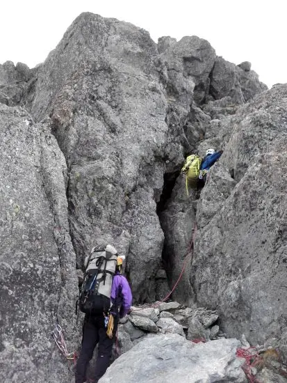 その後はトラブルなく進み、独標上9時半到着(所要3時間)、北鎌平13時到着(所要3時間)。北鎌尾根は近く破線ルートになるのではと言われるとおり踏み跡が明瞭だ。しかし稜線とトラバースを自由自在に行ける感じでかえって迷う。稜線一本に決めればいいのだが、行き詰まると元の地点に戻るのが危険であるため、安全を考えてトラバースすることが多かった。結果としてしなくてもいい懸垂を2度ほどしたようだが、きちんとした支点があったため別に間違えた訳ではない。ルートを知るリーダーがいるか否かで、難易度も時間も大違いであることを今回も実感する。