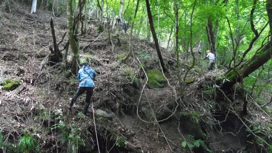 その後は、石積み堰堤を上がった所の斜面での懸垂下降での仮固定と介助懸垂を練習する。今回、介助懸垂の振り分けにPASを使用したのだが、なかなか使い勝手が良かった。2時間程練習して沢を下降する。大滝は右岸の巻道から立木を支点として下降をした。