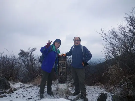 林道をしばらく歩いていくと、橋に出ました。橋のところから薄く山に向かいトレースらしきものが付いています。標識もないので迷いましたが、ここから登り始めました。しばらく行くとしっかりとしたトレースになり、標識も出てきました。ルートに間違いはなかったようです。久しぶりの山なので体が重くゆっくりと登って行きましたが、澁谷さんは体調がよいのか、先頭に立ちぐんぐん登っていきます。危険な岩場と教えられた箇所も雪が付いていたのでアイゼンを効かせてガシッ、ガシッと登ります。寒く雪が薄く舞っていましたが、思いのほか順調に頂上に着くことができました。頂上に着き、やり遂げた達成感を味わえました。満足感にしばし浸っていました。