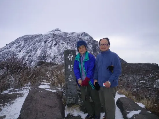 さらに国見岳方面の尾根を進みます。国見分かれの分岐に着くと、今度は登山者と多数出会いました。普賢岳を登り平成新山の噴煙を見る一方通行の巡回登山道があるのです。私たちは巡回などせず普賢岳だけを登るピークハントねらいです。最後の頂上へのコースはかなり急な登りでした。アイゼンを効かせてよっこらしょ、どっこいしょと登っていきました。小さな神社があるところが広場になっていました。そこから頂上までは巡回コースとは方向を変えてひと登りです。頂上に到着すると360度の展望です。目の前が海です。長崎、そして、熊本方面まで見えます。とてもいい気分になりました。風が冷たいので記念写真を撮り景色を楽しんだら食事ができる下の広場に移動です。