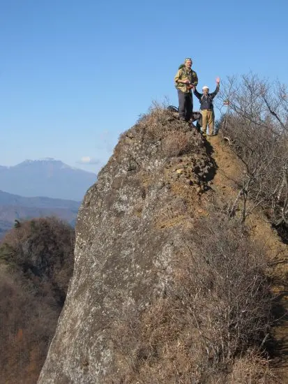 翌日は南牧村の毛無岩へ。こちらは足の指のような形をした西上州の代表的岩峰である。道場からの沢沿いの廃道は数年前の台風で大打撃を受け、流失部も多い。赤テープを丹念に追い何とか通過し、スパッと切れ落ちた岩峰上での大展望を満喫した。