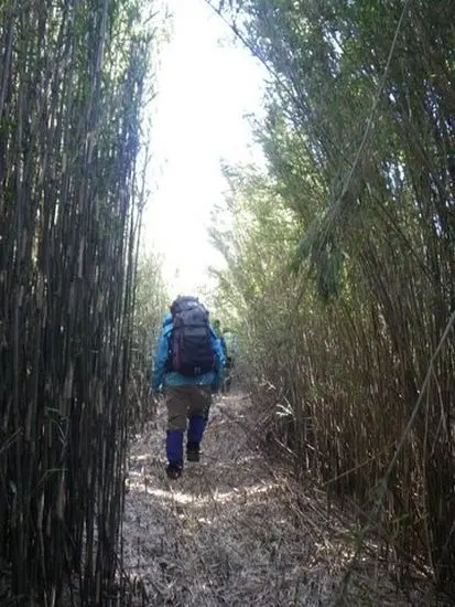 「力ずくで下山」の私の意見が通った。ではと、突入したらあっけなくバンブージャングルは終わり、足下に立派な登山道。南郷山は目の前。安堵感と気が抜けた気分で全員しばらく休んだ。