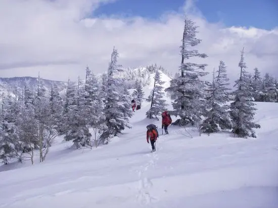 尾根を歩くが例年よりだいぶ雪が多いとのこと。ラッセルが続いた。私はすぐへばってしまって息はゼイゼイ、なかなか進まない。そして、すぐ交代してもらう。