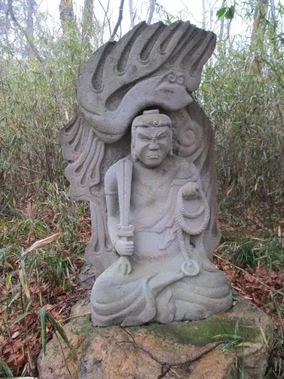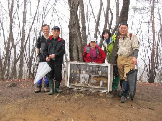 山道を数分歩くと、大きな不動明王像が建立されている。眼光するどく、背後の火焔も躍動感がありすばらしい。へらへら歩いていると、「コラッ!」、と言われそうな迫力だ。1時間ほど歩くと標高321mの神成山頂上に到着した。ここにはイタチなどの動物のフンの標本ケースが置かれている。学術的価値は分からないが、お弁当を広げる主ピークにでーんと置かれているのがおもしろい。