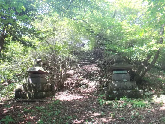 投石峠は西御荷鉾山、東御荷鉾山のちょうど中間点の鞍部となります。まずは東御荷鉾山を登ります。林道を東方面に少し進むと、東御荷鉾山の取付があり、稜線に向けて登っていきます。樹林帯を黙々と進んでいき、45分くらいで東御荷鉾山山頂に着いてしまいました。あまり広くなく展望もない、なんとも寂しい山頂でした。ここにも不動明王様が鎮座しておりました。本来歩く予定だった法久集落からの東側からのルートに進んでみると、どうもこちらが表参道のようで、立派な常夜灯が2基あり、その横もかつて登拝の際に儀式を行ったのではないかというスペースがありました。冬枯れの時期に是非この法久集落からのルートを歩いてみたいものです。