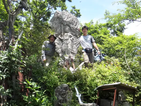 ルートはとても歩きやすく、数人の登山者とすれ違い、お話を少ししたりして50分くらいで見覚えのある手作りの青トタンの指導標が見えてきました。樹木の茂り方で4月に来た際と全く景色が違います。下仁田側の不動明王様にご挨拶をして、展望が素晴らしい山頂へ進みます。本来はここで広瀬さん、勝部さんと合流予定だったのですが、登っている最中に広瀬さんから、「勝部さんが気持ち悪くて歩けない!」というメールがあり、駐車場で待っているとのこと。