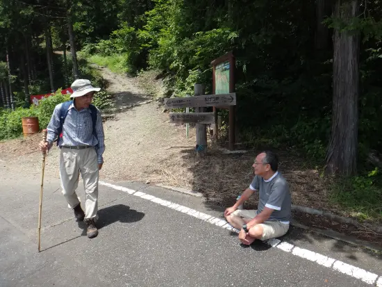 木陰でしばし休憩して、勝部さん、広瀬さんが待つ駐車場へ下山です。登山口に近づくと誰かがどかっと座ってます。明らかに勝部さんでした。車で林道を上がってくる際に車酔い?酒酔い?したようで歩けなくなってしまったようです。でも元気そうで何よりでした。