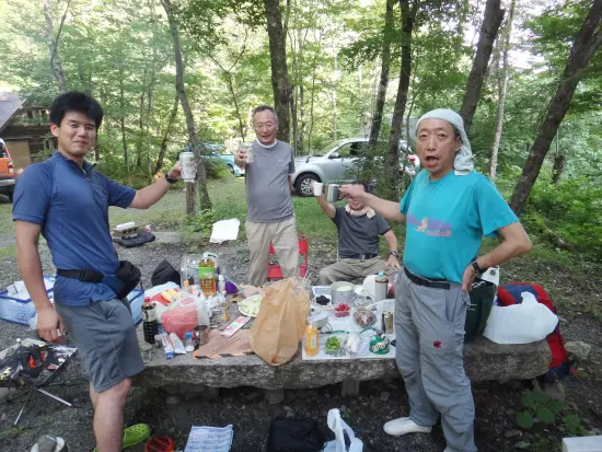 メンバーが下山後に全員集合したので今回の山行の核心へ進みます。まずは、すぐ下のみかぼ高原荘のお風呂に立ち寄り軽く汗を流します。はじめて行きましたがこぢんまりしていて、景色もよく、また使いたいお風呂でした。