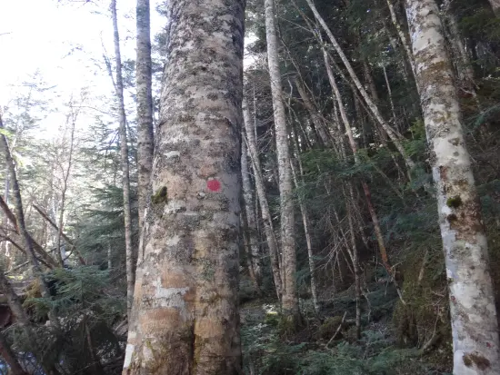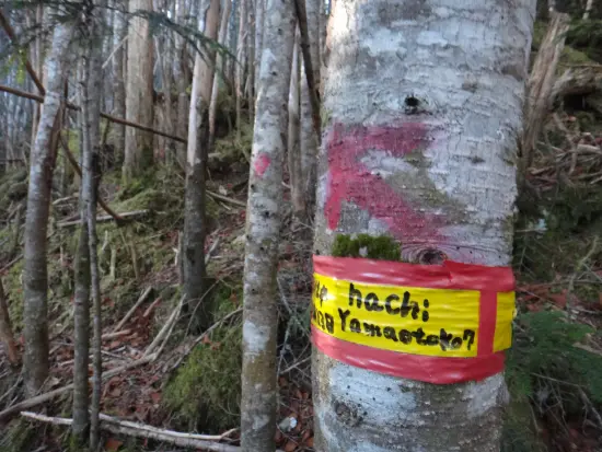 あたりもまだ暗い6時10分に出発。今日は天気も珍しく良さそうなので御室小屋までなんとか進みたい。国師ヶ岳までは最後の支尾根に合流するまではトラバースするような感じで尾根まで進むようなルート。昨日の夜からなんか迷いそうだなあ~と思っていたのですが、やはり非常にわかりにくいです。目印は例の赤丸スプレーのみで、さらにスプレー箇所が少なくなっていて、最低限しかつけていない感じです。赤布とは違って幹一か所の赤丸スプレーなので見る方向がずれるとなかなか見つからないです。踏み跡が怪しいとすぐに戻り、再考を繰り返します。昨日に引き続き、飯塚さんの眼力が冴えまくってます。飯塚さんの「あった~」が何度も樹林帯に響き渡ります。途中、ヤマレコで見たことのある【hachi/Yamaotoko7】黄色テープを見つけ、ひとまず安心。