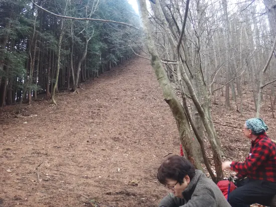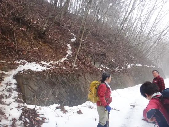 1時間ほど歩いてようやくゲートがある坂脇峠に到着です。ゲート先が小屋敷林道で、我々はこの林道を進みます。しばらくして尾根が下がってきて取付けそうな場所を選んで登ろうとしましたが、北面で雪が付いていて滑るので一応軽アイゼンを付けて稜線まで上がりました。上がるのに結構難儀してしまったようでした。少し進むともっと楽に上がれたので申し訳なかったです。