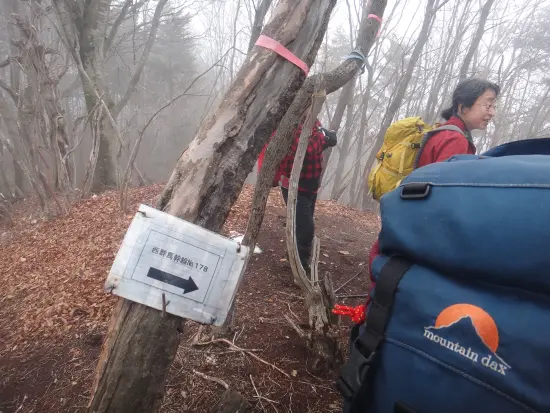 稜線に上がるとまったく雪がないので、すぐに軽アイゼンを外して滑沢山を目指します。いきなりの急登で堪えます。本日の標高最高点1,291mの滑沢山にはこの界隈によくみられる味のある山名板がありました。まだ、霧は抜けておらず、少し先しか見えない状態でした。ここからは少し下りながら最初の分岐ポイントの1,250mPを目指します。家での予習でもここは注意をしなくては!と思ったのですが、まんまと引っ掛かりました。鉄塔を目指すことばかりを考えていたのですが、目指す鉄塔は霧で全く見えずに、小ピークと思える個所に『西群馬幹線No.178⇒』とあり、これだこれだ!と思ってしまい、歩きやすい急坂を下ってしまいました。とても歩きやすいルートなのですが、どうも一気に下降しすぎで、すぐに出てくる鉄塔はないし、一旦台地状になるはずなのにまだまだ下降しようとしている・・・。しまったと思い地形図を見ると、右隣りの尾根をまんまと下っておりました。1,250mPはもうひとつ先の小ピークであり、我々は一つ手前の小ピークから、となりの鉄塔を目指して下降しておりました。後から確認すると目指す鉄塔は177号鉄塔でした。早めに間違いを修正できてよかったですが、下降する場所を確定させるのは本当に難しいです。よくやるチョンボです。トラバースは危険なので、皆さんには申し訳なかったですが、もう一度稜線まで登り返しとなりました。おかしい?と思ったらすぐに地形図で確認するのは大切な作業だなあと(ルート間違えの言い訳・・・)。