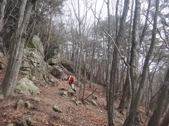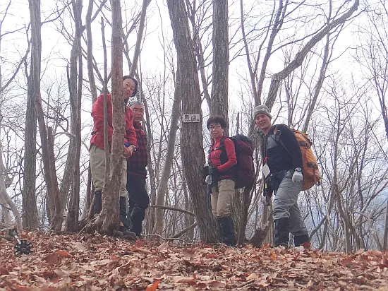 一気に登って行くと1,002mPに到着です。赤い恩寵林の石票がありました。ここからは大きなアップダウンはなく、次のピークには御料局三角点がありました。恵林寺山も一登りで到着です。こちらには三角点がありました。山頂には扇山と書かれた陶器の山名板はありましたが、恵林寺山と書かれた山名板がなくて残念でした。冬木立なので多少の眺望があり気持ちいいです。