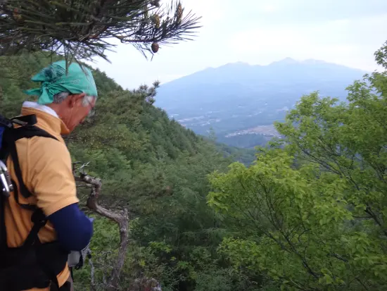 岩峰を下がり、南方面への薄い踏み跡を進み比志の塒を目指します。地形図には記載されていませんが、尾根上に岩峰が多少あったりしていくつか巻きながら進みますが、全く危険因子はありませんでした。左側に目をやると茅ヶ岳や瑞牆山方面の景色がとても綺麗で気持ちがいい尾根だなあと感じました。