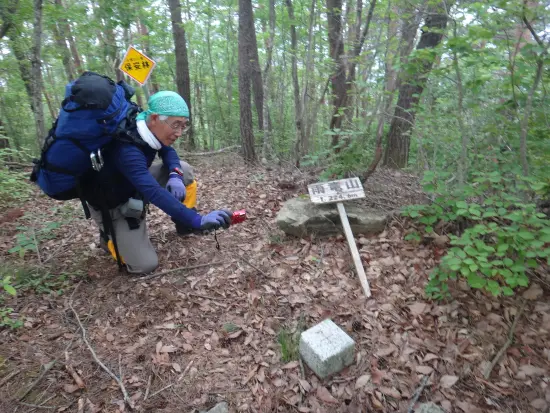 その後は南へ下り、西方向へ進み、境界見出標21号の小ピークで尾根が分かれるので、地形図を出してみんなで確認します。右側の尾根(西側の尾根)が正解で地形図の林道のヘアピンカーブ側に向けて踏み跡を進みます。途中から尾根から外れてトラバースする感じで下る踏み跡があったので進むと、途中から尾根ルートから外れてトラバース気味に下降する感じとなり、林道が見えてきました。林道降り口にはお地蔵さんが静かに佇んでおりました。方面の崖などもなく無事にヘアピンカーブの少し北側の峠に降り立ちました。石仏峠と勝手に私は命名していましたが、実は峠の名前はないようで、「石仏のある峠」と命名したいと思います。