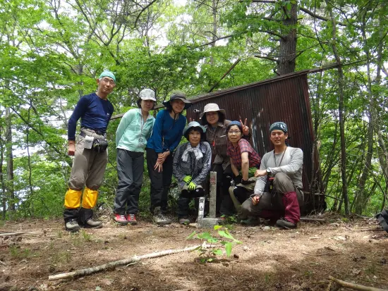 結局登り出しは12時前となり、おそらく幕場は笠無の先ぐらいになるのでは・・・と思い始めました。明日頑張れば!というフレーズが聞こえ始めました。海岸寺峠から薄い踏み跡をたどり取り付き、15分程の緩い登りで三角点のある海岸寺山に到着です。眺望のない山頂です。林道からあがる南側からの踏み跡も確認できました。陽射しはありますが自然林の眩しい新緑を眺めながらの登りでそれほど暑さは感じませんでした。標高もすでにある程度高いので清々しいです。そして小ピークを一つ越えて登って行くと、珍しい山名の笠無には14時に到着です。