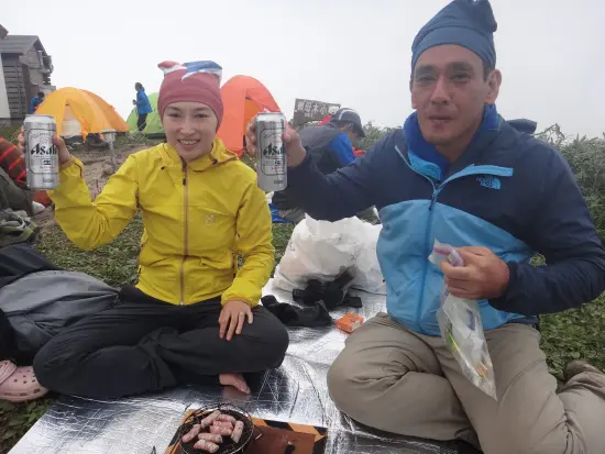 そこを過ぎるとびっくりするぐらい広いテントサイトがある本山小屋下に到着です。まだ時間は13時過ぎですが、平野SLが明日の朝日を飯豊山でみたいので、ここで切りましょうというご提案が。本来は御西小屋まで頑張る予定で、時間的にも15時くらいには御西小屋に到着予定でしたが、少し稜線も雲が出てきて、確かに御西までの稜線がガスっていては感動が半減するなあと。私も歩きながら本山小屋で切ってもいいかなあと思っていました。実際に着いてみて、テントサイトは飯豊山も見えて素晴らしいし、水も豊富だし。早々にテント設営です。小屋とトイレまでが太郎平のように遠く、登らなくてはいけないのが残念ポイントでした。ロング缶ビールは我々が最後で売れ切れてしまいました。良かった~。ただ1本1,000円ですが、これが飯豊価格なのです!この価格設定は飯豊に入ると麻痺するので問題なかったです。その日はテントの外で、素晴らしい景色を眺めながらのんびりできて良かったです。明日は絶対に頼母木小屋まで歩かなくてはいけないので早めに就寝です。