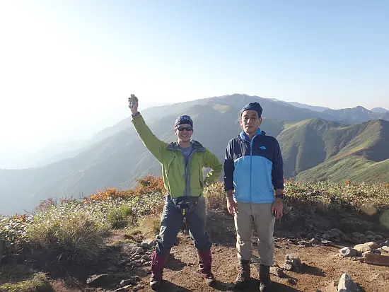杁差岳から大石山へ戻り、平野さんと9:30に合流。平野さんに山頂で手を振ったけど見えたかなと確認すると、「まったく何も感じなかった。」とつれないお答え、「そんなことより、ビッグサプライズがあります。」とのこと。なんと頼母木小屋でお留守番の間に、小屋の方々や支援をされている地元山岳会の方々と仲良くなり(手だまに取り!?)、奥胎内ヒュッテで待っていてくれれば、中条駅まで車で送ってくれるとのこと。「さすがエジ?~(平野さんの通称)」と、峯川さんと感心しきりとなりました。おかげさまで、その区間のタクシー代約8,000円が浮きました。