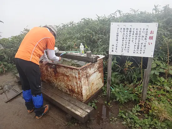 朝から天気が良いかと思っていたのですが、あまり良くなくて、ガスガス状態で雨もシトシト降ってくる感じです。昨日歩いたルートですが暗く、足元が濡れていて良くないので慎重に登っていきます。1時間半ほどしてようやく十森水場に到着です。祓川より綺麗な水がしっかり流れていました。湧水ではなく沢水です。もうひと頑張りして登って行くと樹林帯を抜け出します。ここが松平峠です。まだガスが抜けてくれません。ザレた尾根を登って行くと山名板などないですが、猪鼻という地点を通過します。昔のエアリアでは水場マークがあり、確かに少し下がると沢の源頭のような感じですが、枯れている感じです。あてにならないので水マークを外したのでしょう。やはりこのルートでは十森で水を汲んだほうが良さそうです。鏡山からのルートと合流する疣岩分岐に到着し、疣岩山まで進みます。三角点はありましたが、山名板などはありませんでした。ここぐらいから祓川小屋で一緒に泊まった人たちが追いついてきて抜かれていきます。頑張らないとです。なかなかガスが抜けそうで抜けない感じで三国小屋に到着です。雨も降り出し、平尾さんは残念そうです。でもナナカマドが真っ赤になっていてこの先は紅葉が楽しめそうです。昨日宿泊予定だった三国小屋の物件調査をしましたが、感じの良い小屋番さんもいて、なかなか良い小屋でした。ただ、昨晩は宿泊者が凄かったようです。逆に祓川小屋で一番乗りで場所を確保したほうが良かったかもしれません。350m缶のビールが700円で飯豊は一番安いかもです。