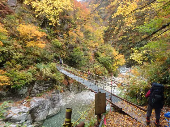 計画当初は、逆からのコースだったが、湯の平温泉に続く吊り橋が11月1日10時で撤去になることを知り急いで逆コースに変更。結果的にはメンバーも含め良い判断だった。