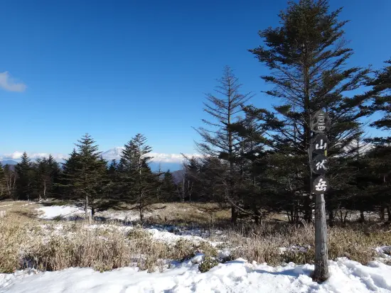 年末とは思えない、ぽかぽか陽気で足取りも軽く、12時前に八紘嶺に到着です。私は昨年5月一人温泉旅で訪れた以来で山頂の雰囲気は全く同じ感じです。アッコさんは昨年1月の七面山の宿坊山行以来で、そのときはたっぷり雪がありワカンで八紘嶺にたどり着いたようです。昨年の正月とは全く状況が違うようです。