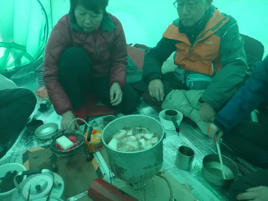 ここからの登りは初日の重いザックには堪えますが、時間もあるのでゆっくり登ります。そして、先月の例会でも通過した山伏小屋への分岐ポイントである西日陰沢分岐には12時半過ぎに到着です。なんとかうっすら雪が積もっている状態です。ここでザックをデポして山伏小屋まで下り各自水を確保です。水は凍結せずにしっかり流れておりました。幕場は景色も良いので山伏山頂となりました。雪がほとんどかぶっていない富士山を綺麗に眺めることができました。私は3回目の山伏で初めて富士山を拝むことができました。時間もあり、雪が少しあったので一袋の雪袋分だけ雪を溶かして水を作りました。今宵の晩ご飯はちあきさん作、きりたんぽ鍋でした。とても美味しかったです。