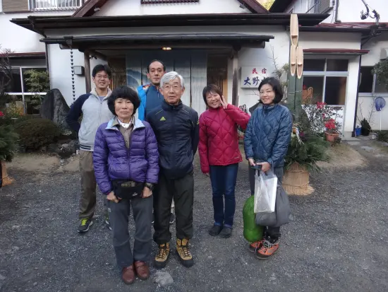 大野木荘の玄関にはびっくりするほど大きな門松があり、ここでようやく正月気分を味わうことができました。下山しているときもどうも正月、厳冬期の寒さではなくて11月末くらいの初冬の雰囲気でどうもピンとこなかったのです。宿は昨年リニューアルしたそうで、とても綺麗です。早速温泉に向かいますが、PH10.5のアルカリ性温泉でお肌がつるつるになります。とてもいい温泉で私好みでした。朝晩含めて5回くらい入浴しました。お楽しみの元旦の夕食でみんなで祝杯をあげました。そして、正月からみんなで温泉宿というのは初めてかも知れません。みんなでわいわいと楽しい夕餉となりました。