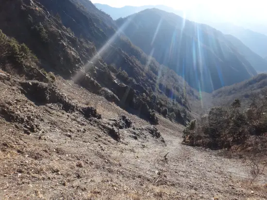 | 【12月31日】 | 安倍峠(6:30) → バラの段(7:20~30) → ワサビ沢の頭(8:15~25) → 大笹の頭(9:05) → 奥大光山(9:50) → 大光山(10:25~45) → 刈安峠(11:15) → 黒崩(11:35) → 十枚山(13:10~30) → 十枚山の肩(13:35)【幕営】 |