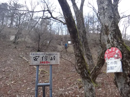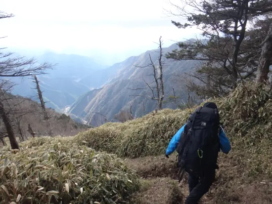 新窪乗越についたときに、おそらく八紘嶺も雪はないと悟り、当初の幕営予定だった八紘嶺は通過し、水が確保できる安倍峠まで進むということがほぼ確定となりました。八紘嶺側から来る単独の登山者に雪の状況を聞くと、まさにそのとおりでした。