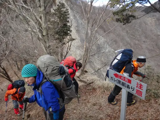 沢を幾つか跨ぎながら進むと十枚山直登ルートに合流しますが、我々が降りてきたルートには通行禁止の札がかかっていました。確かに沢沿いのトラバースルートは崩壊している箇所もあったのであまり多くの人が入らないほうがよいかもしれません。
